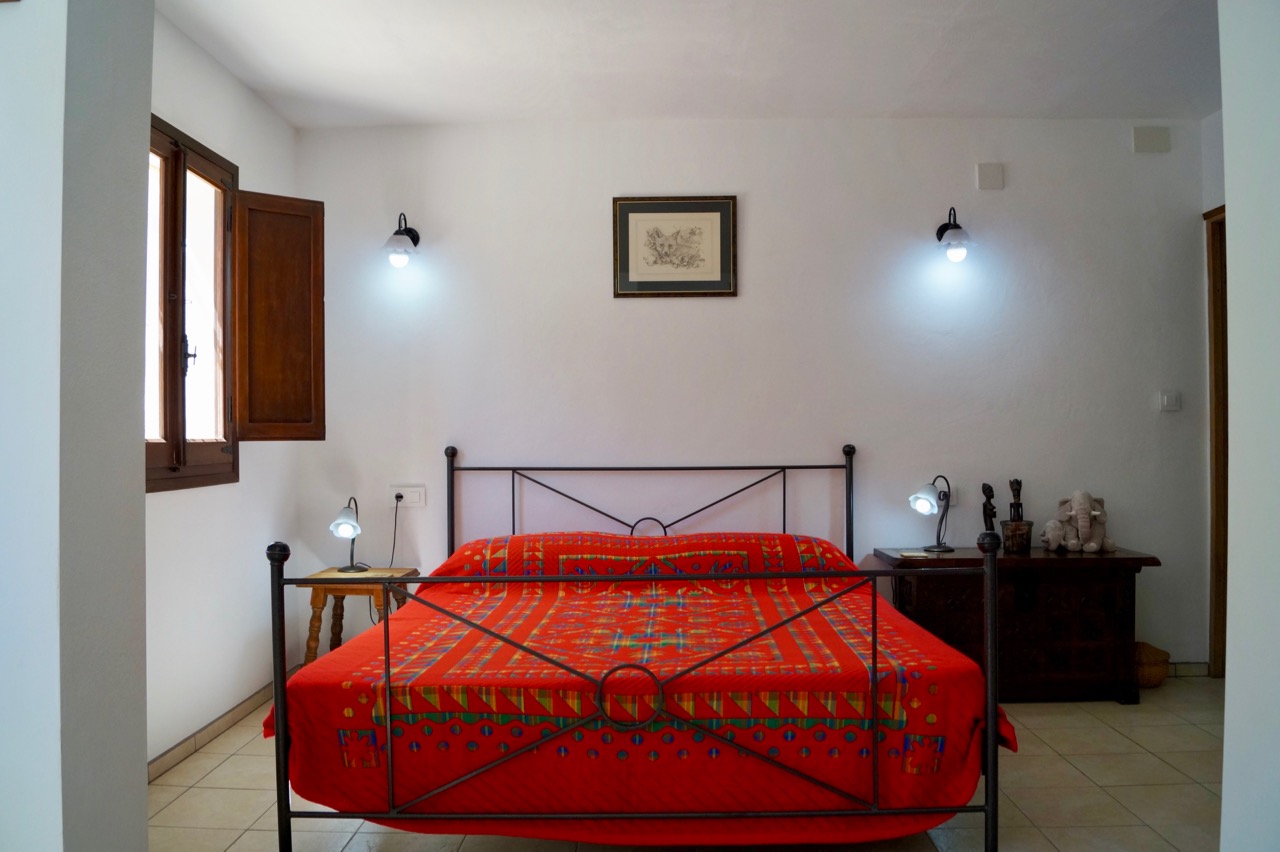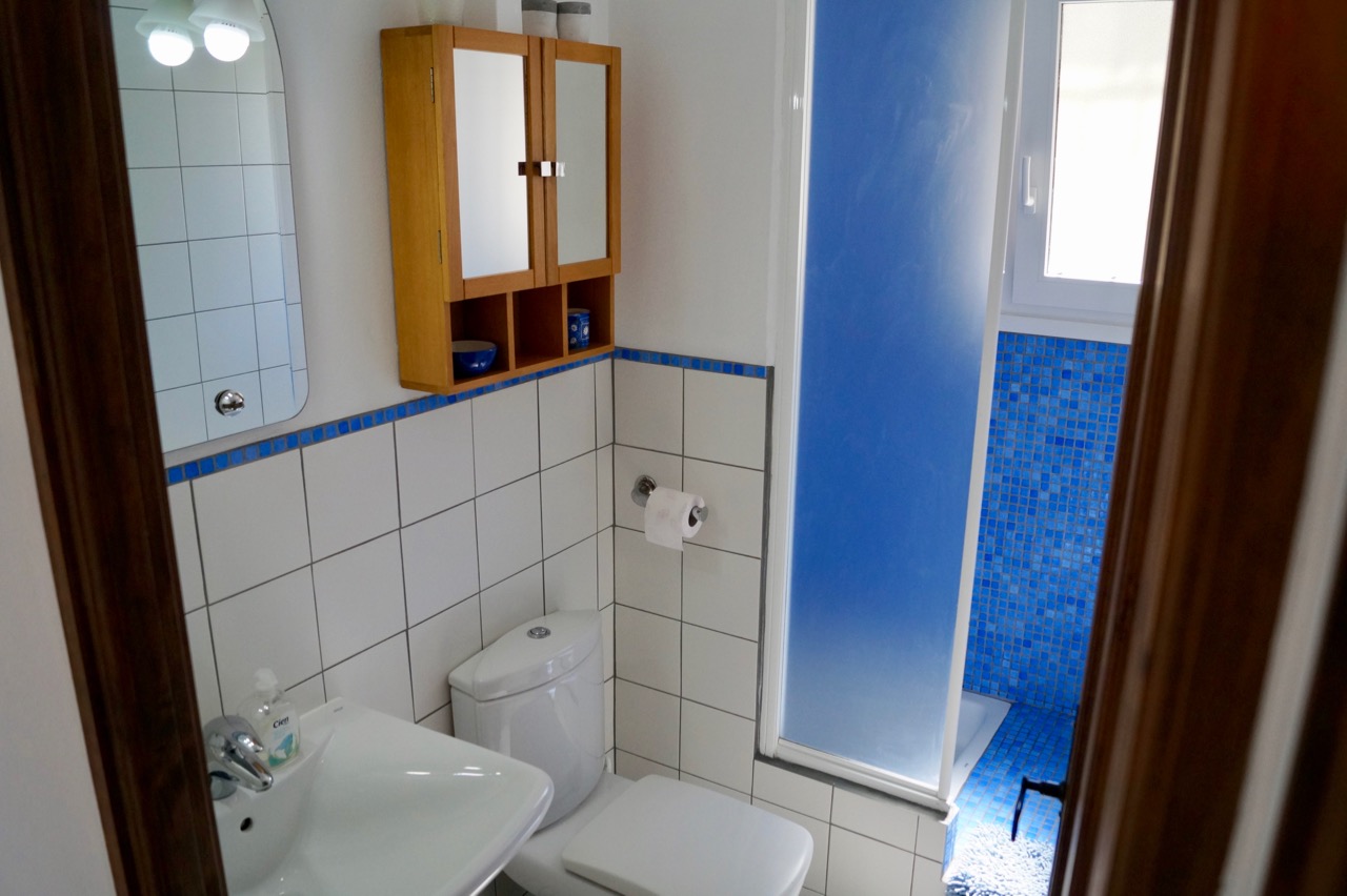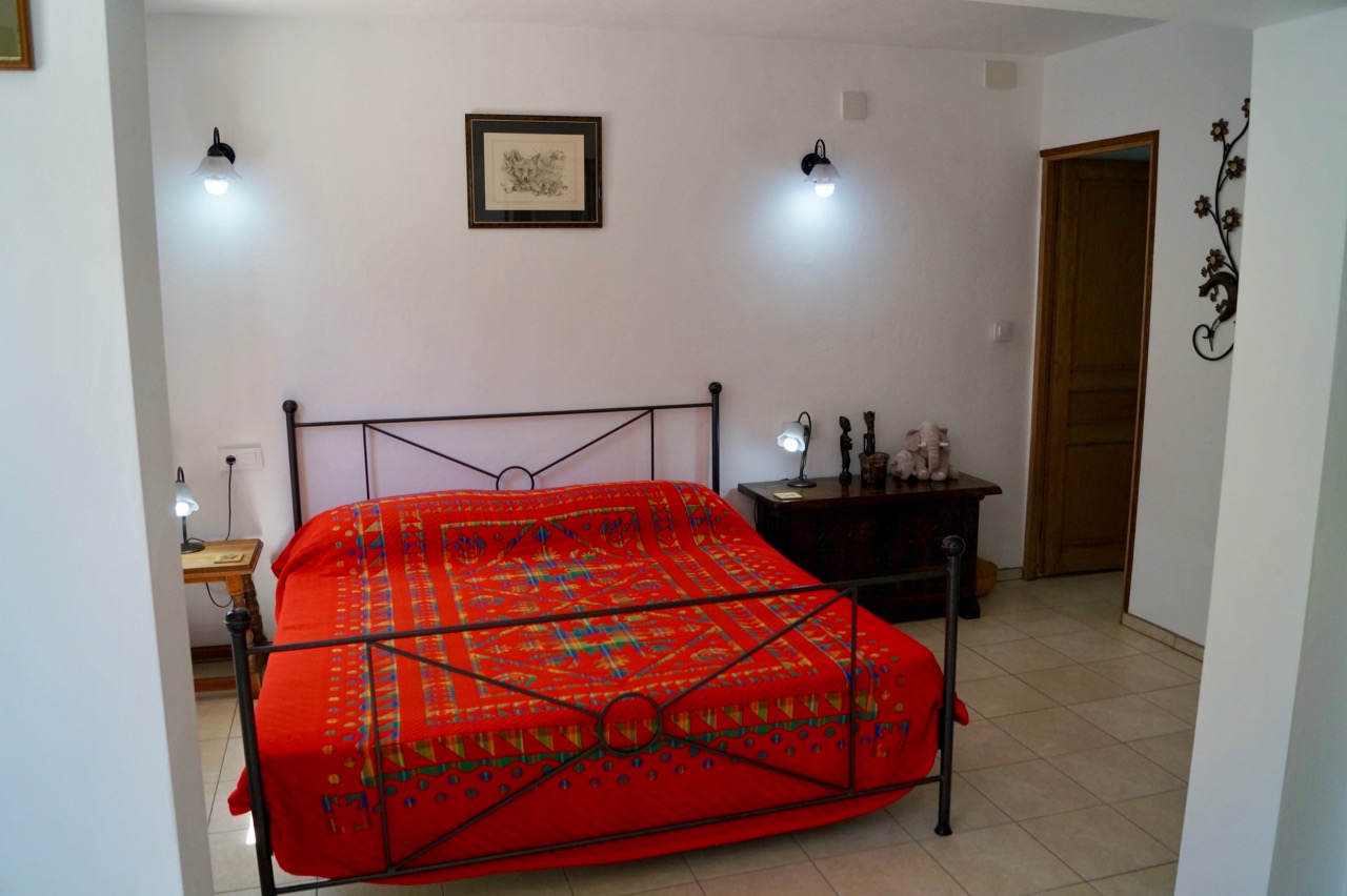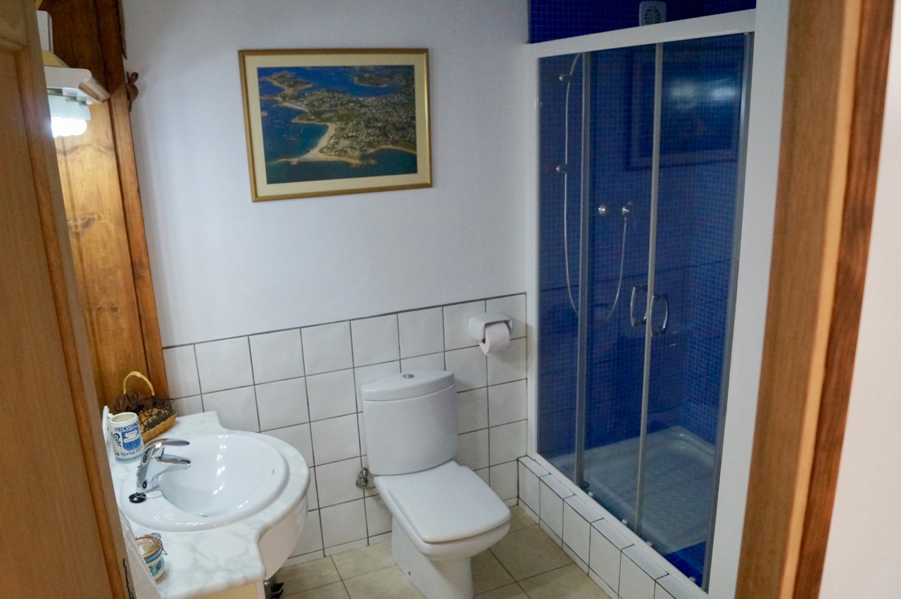 The open plan living area consists of a fully equipped dining-kitchen and a lounge with a large wood burner. Doors lead out to a large terrace with nice sea views and partly covered with a pergola. On this level you also find a double bedroom and a shower room.