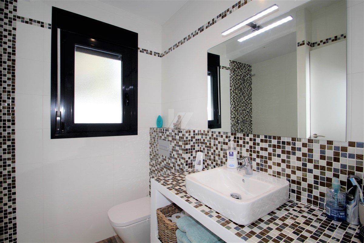 On the ground floor there is a lounge with access to the covered pool terrace and outdoor dining area with kitchen, 2 bedrooms with bathroom en suite (one of them with access to the terrace), 1 bathroom and the third bedroom. An internal staircase leads up to the upper floor, equipped with large open living and dining area with sea view, open modern kitchen, 1 guest WC and 1 bedroom with bathroom en suite. From the living area you reach a nice terrace and the roof terrace, both with sea view.