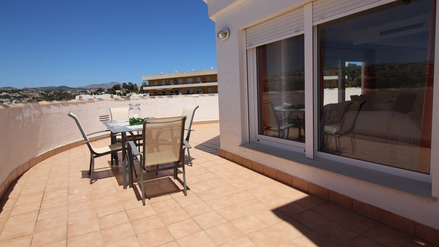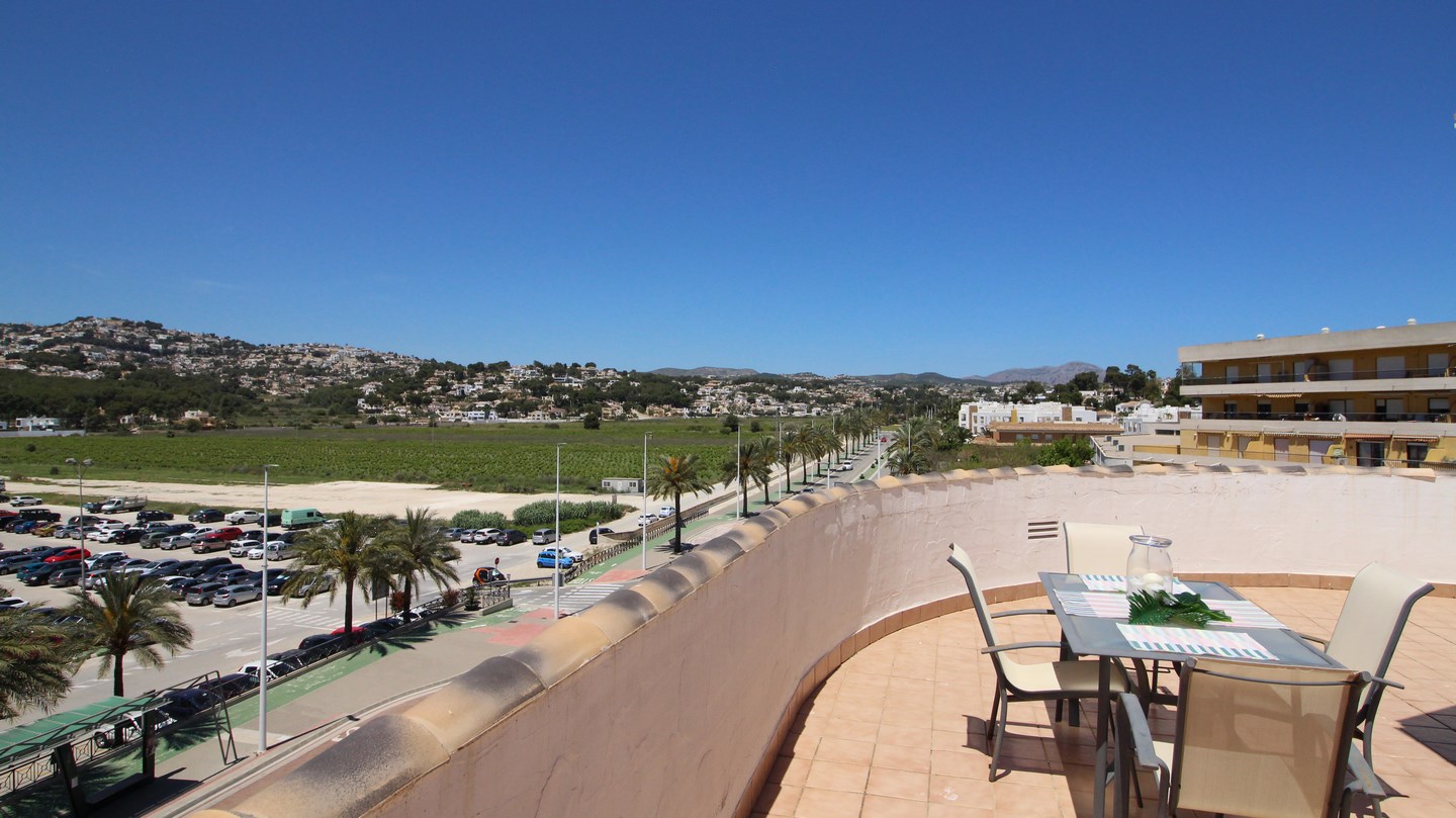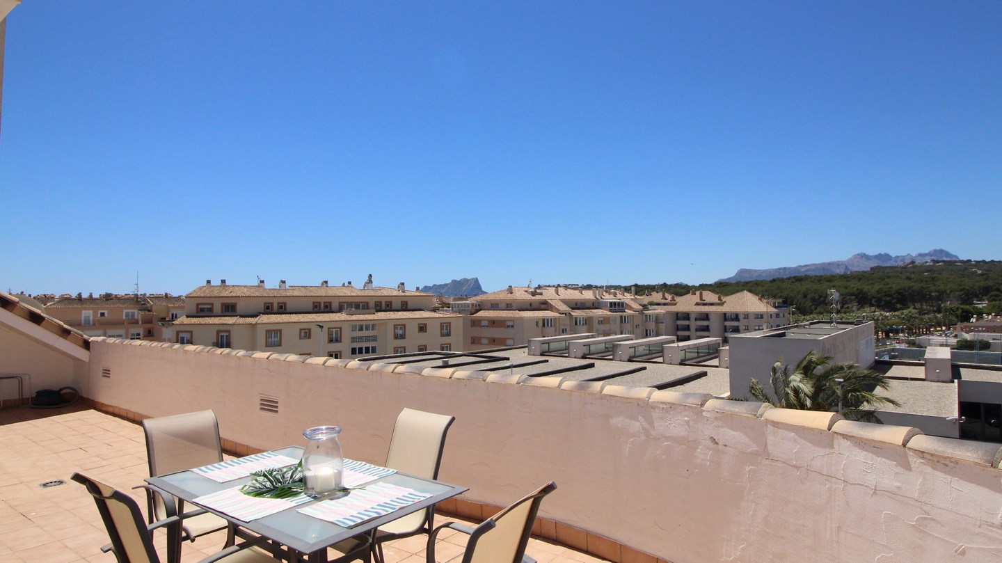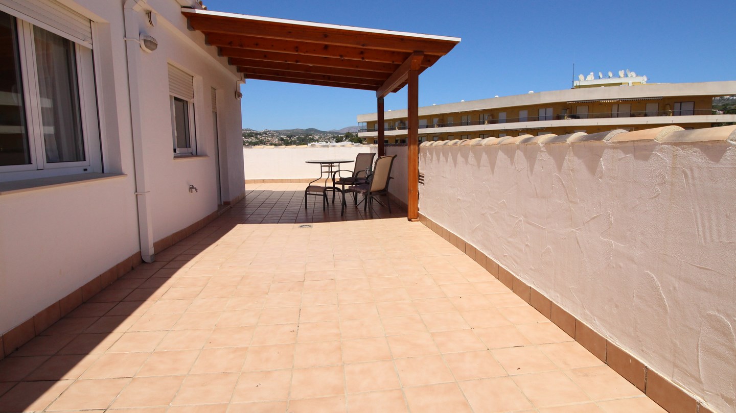 Located in Moraira town centre, this 4 bedroom, modern penthouse could work as both a permanant residence or a very lucrative rental investment for both long and short term stays. The apartment block is one of the newest in the town and is 1 of only 4 blocks in Moraira to have a communal swimming pool and garden. Entering the penthouse we find 3 bright, double bedrooms, one of which has an en-suite bathroom, and a family shower room. The spacious and luminous living-dining room and kitchen is all open plan and has 2 accesses to the 90m2 terrace, wrapping around the apartment enabling the option of having sun or shade outdoors all day long, and enjoying the panoramic views and both the sunrise and sunset over the Bernia mountains. Connected by a spiral staircase, upstairs we find a very large bedroom and a shower room.