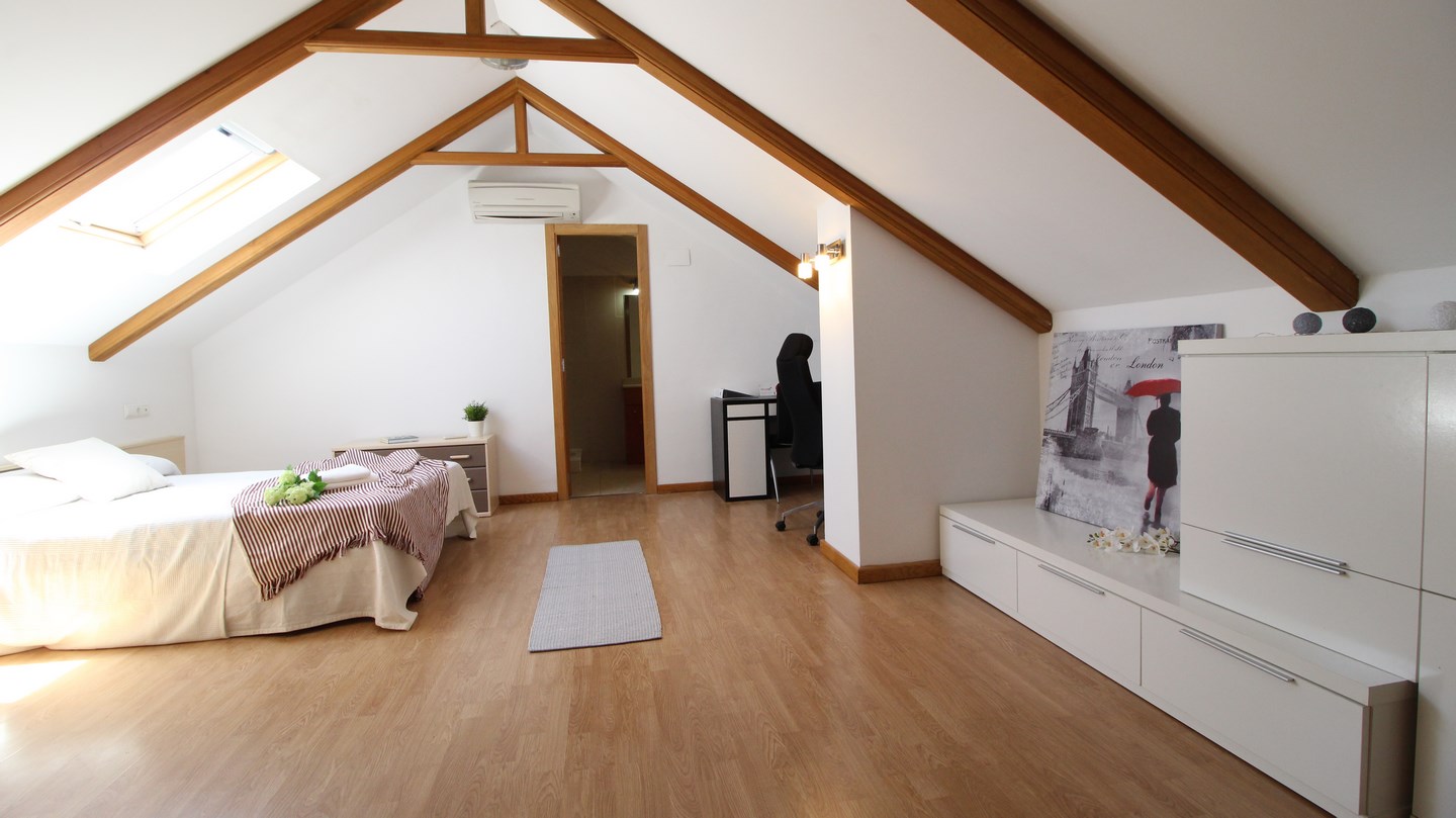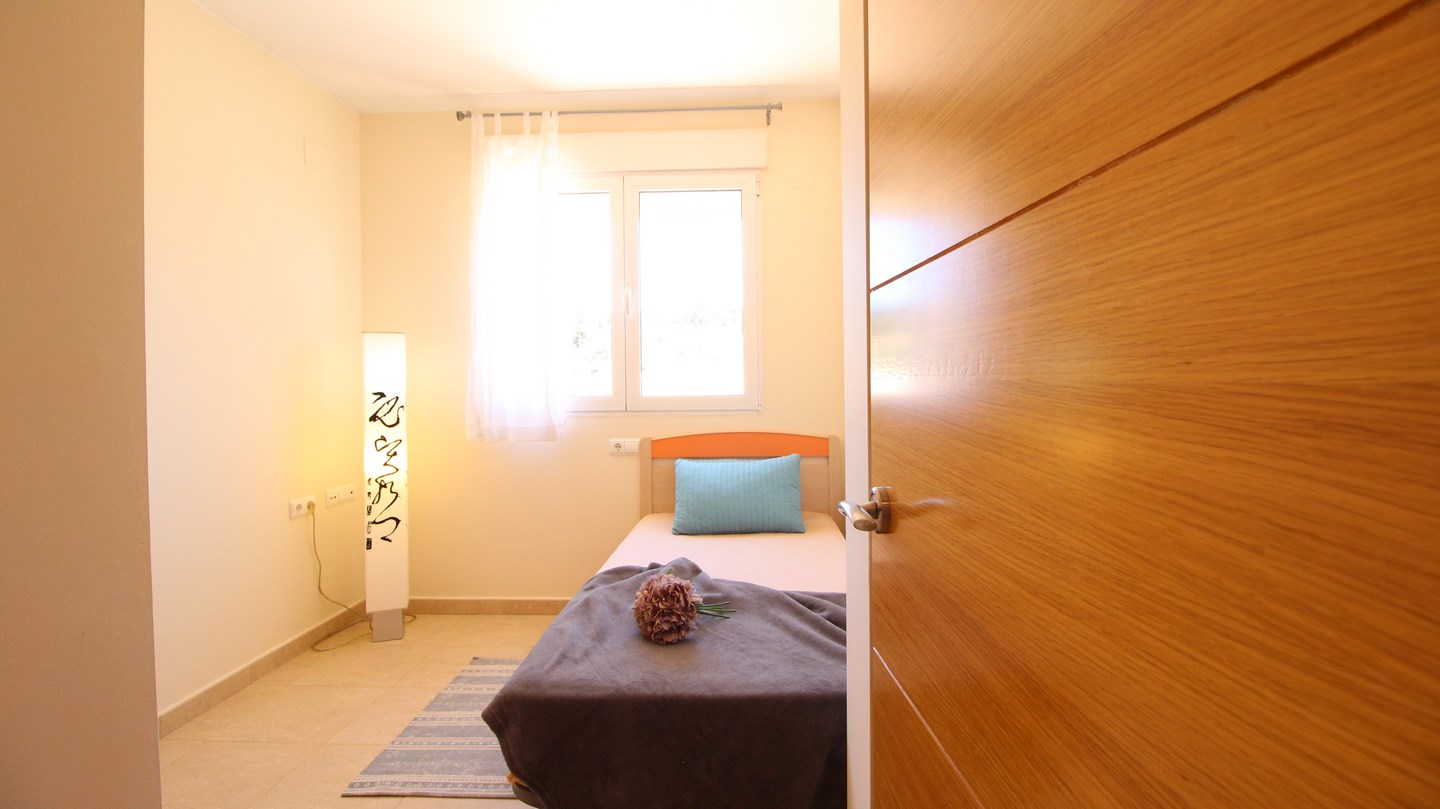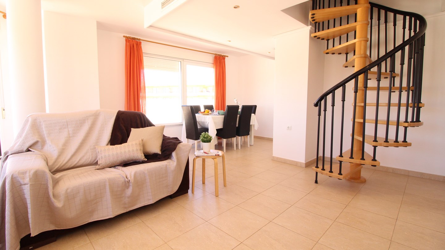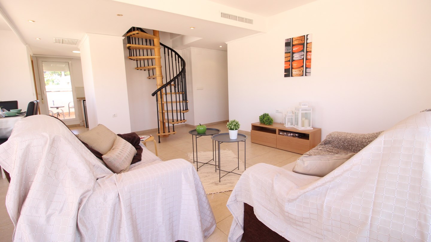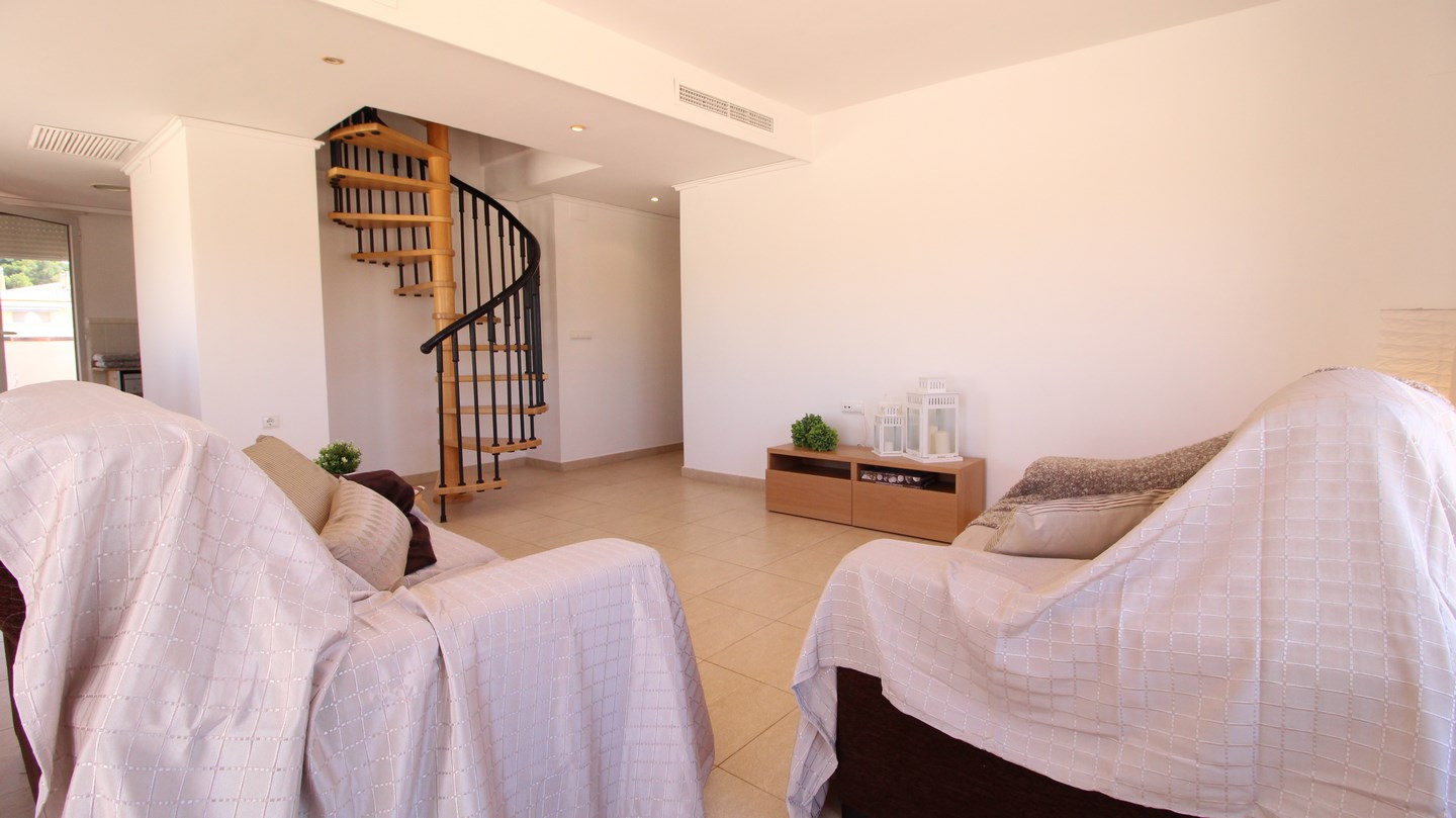Located in Moraira town centre, this 4 bedroom, modern penthouse could work as both a permanant residence or a very lucrative rental investment for both long and short term stays. The apartment block is one of the newest in the town and is 1 of only 4 blocks in Moraira to have a communal swimming pool and garden. Entering the penthouse we find 3 bright, double bedrooms, one of which has an en-suite bathroom, and a family shower room. The spacious and luminous living-dining room and kitchen is all open plan and has 2 accesses to the 90m2 terrace, wrapping around the apartment enabling the option of having sun or shade outdoors all day long, and enjoying the panoramic views and both the sunrise and sunset over the Bernia mountains. Connected by a spiral staircase, upstairs we find a very large bedroom and a shower room.