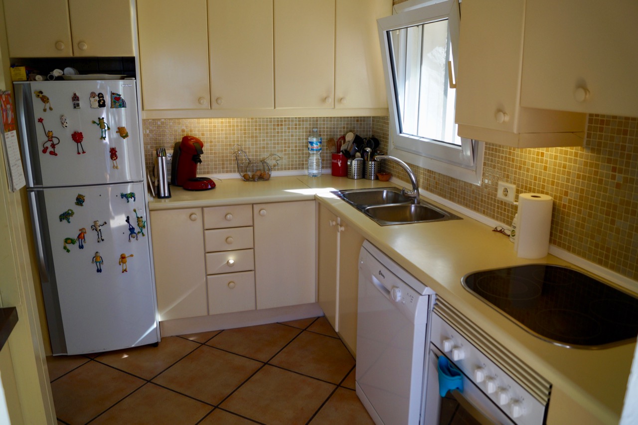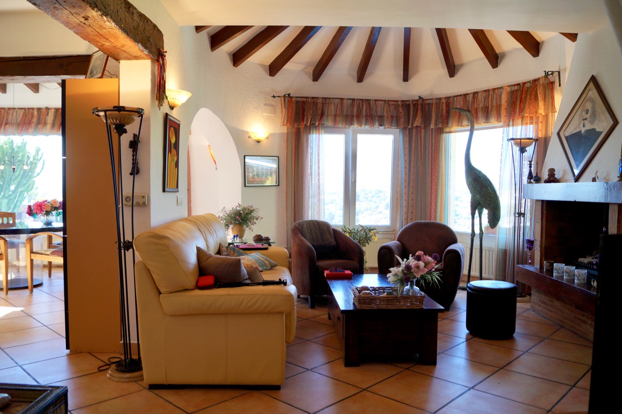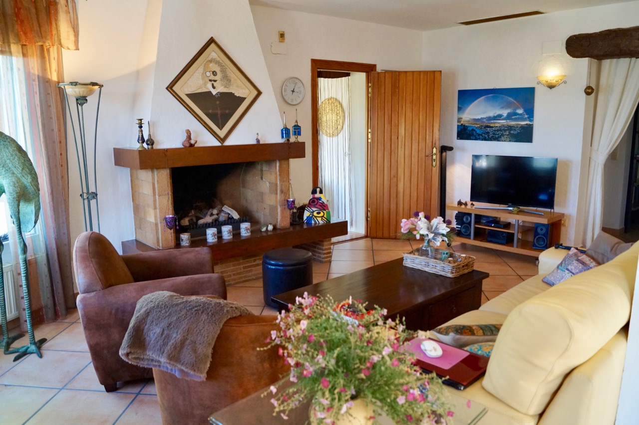 A separate pedestrian gate with some steps down brings you to the front door where you enter the villa into the entrance hall, then a spacious open plan living with a log burning fireplace, dining area and kitchen with large windows looking out over the Mediterranean Sea towards the Calpe Rock Peñon de Ifach and the Bernia mountains.
