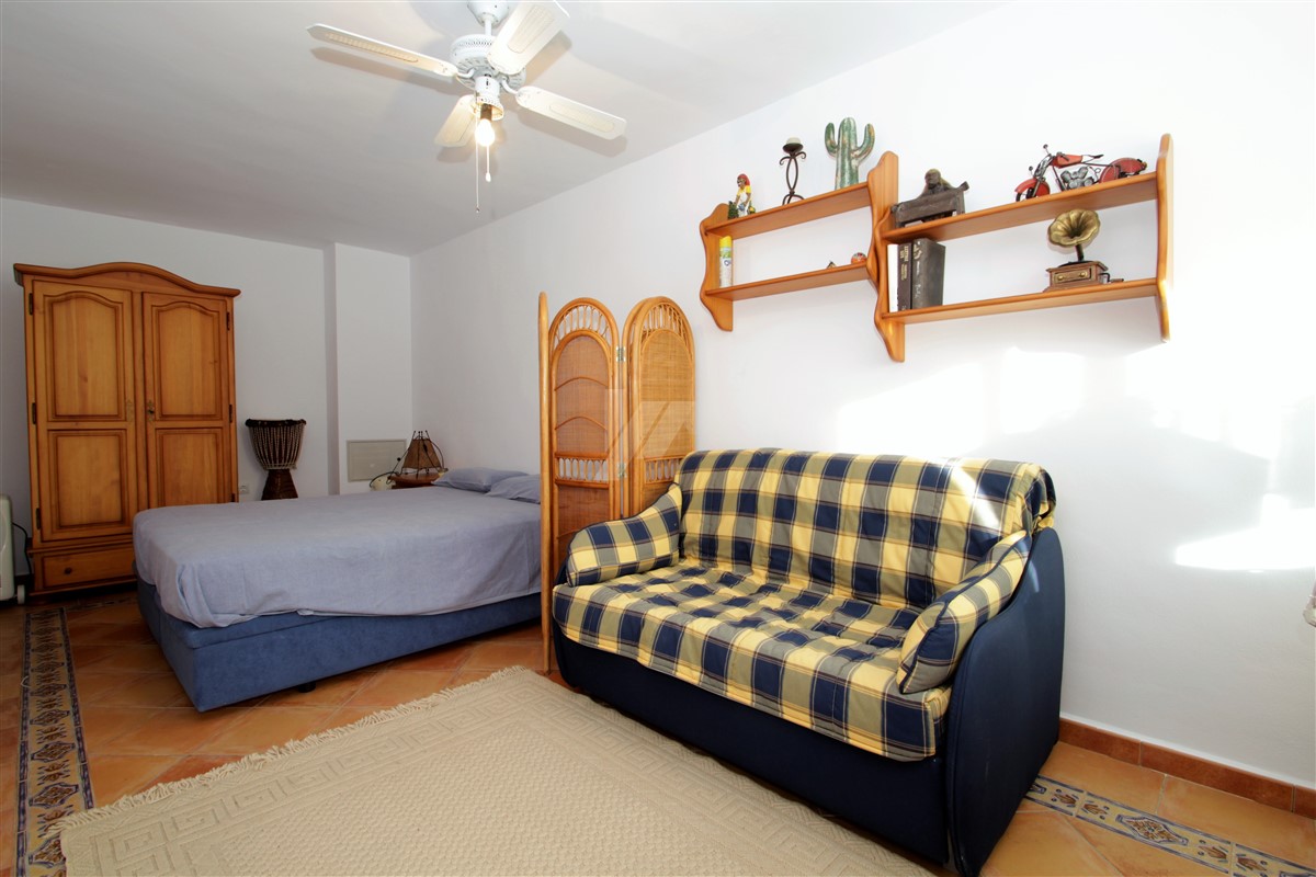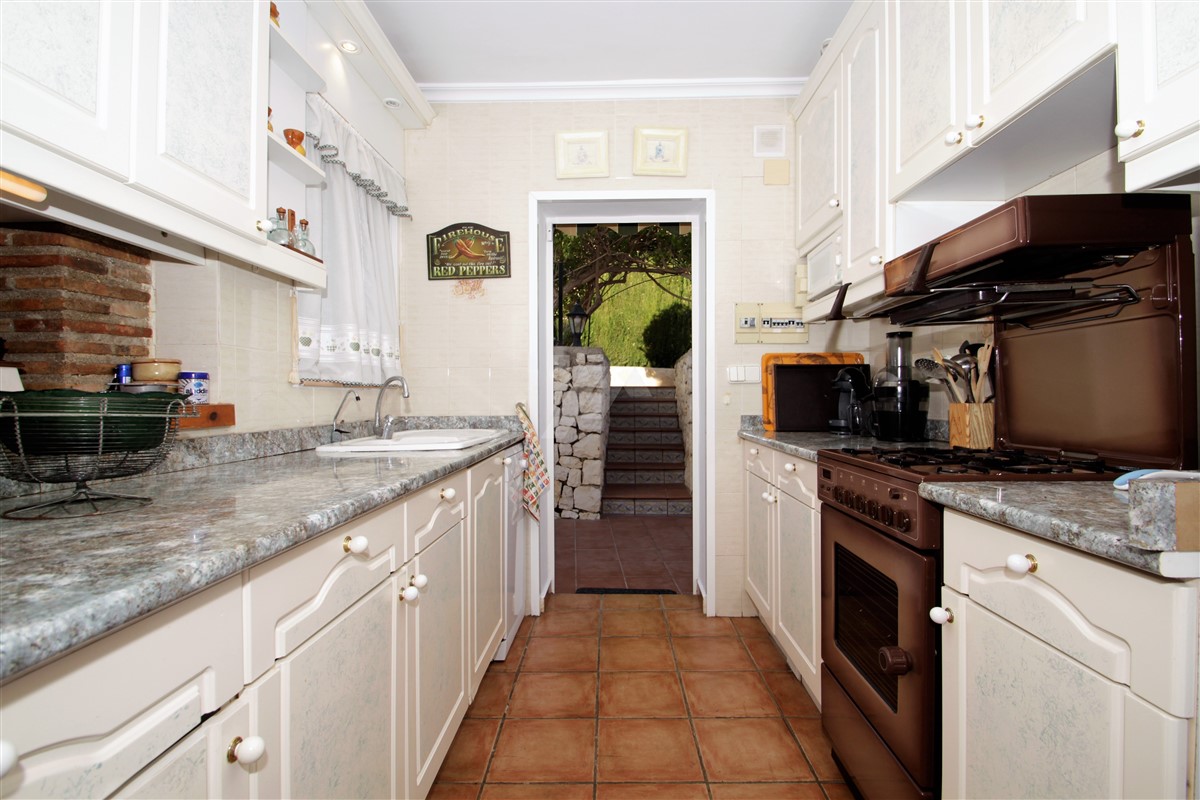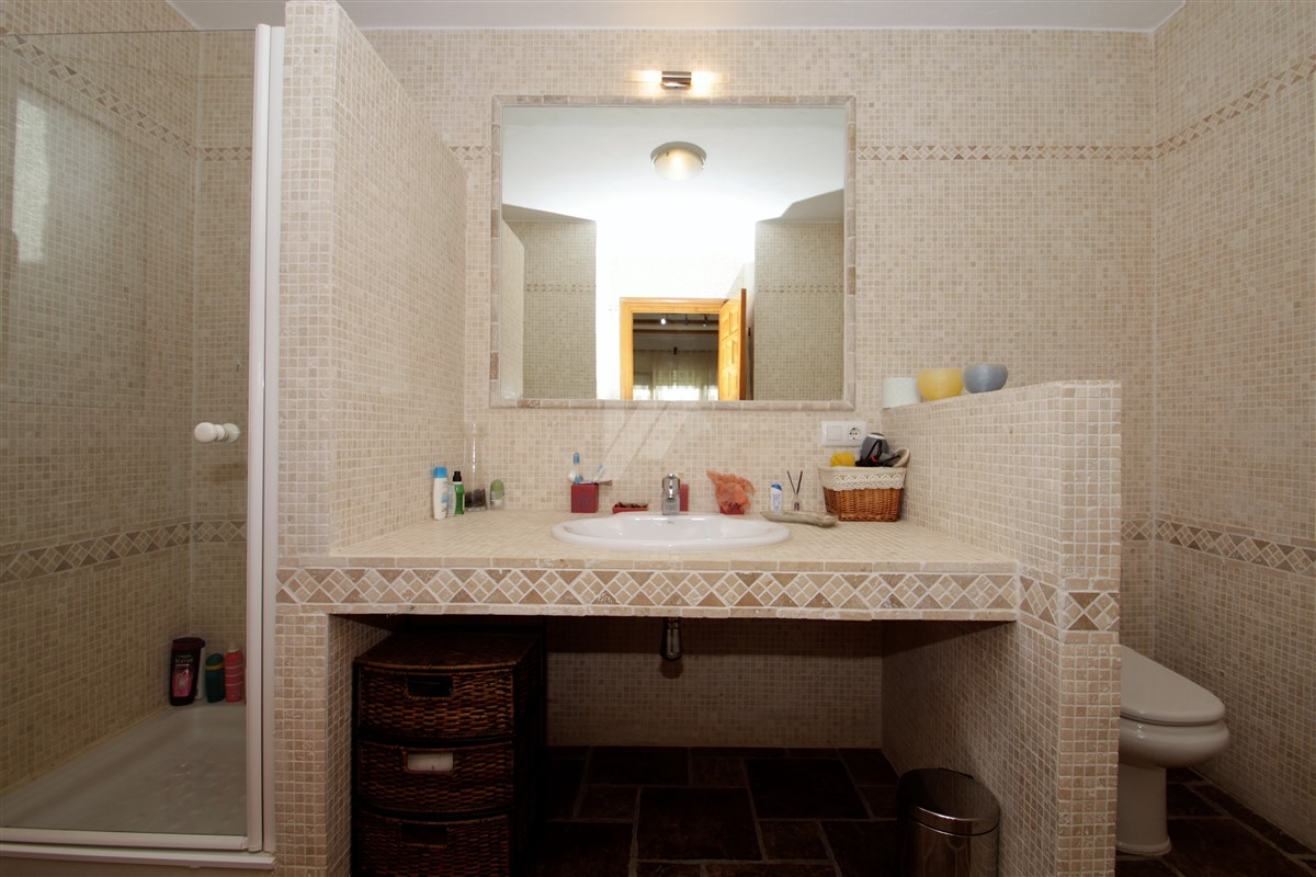 Access to the property can either be made via the electric gates opening to a garage, or via the pedestrian gate opening to a patio where a few steps lead up to the main level of the villa. On the main level we find the lounge/dining area with log burner followed by the separated kitchen with access to the barbeque area. An inner hallway gives access to two double bedrooms and two bathrooms, one of which en suite. The external stairs lead to the upper level where we find a double bedroom with an en suite bathroom. There is also a guest apartment comprising of a large double bedroom with an en suite bathroom on the lowest level.
